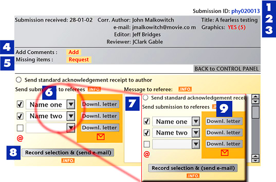 META DATA (1) Manuscript ID with journal acronym, year and unique number. Clicking on the ID shows all current manuscript meta data. (2) The title shows the first 20 characters of the contributions title. Clicking on the title will open the PDF file of the full manuscript. (3) Add graphics, indicates that no graphics have been submitted. Yes (3) indicates that three figures have been uploaded. COMMENTS & MISSING ITEM REQUESTS (4) Click on Add Comments to enter your own personal notes for the manuscript handling of this specific submission. The comments can be deleted or changed by clicking on the text lineThese comments follow the manuscript through the entire editorial process but cannot be viewed outside the system. (5) Click on Request missing items for requesting missing manuscript items from the author either by e-mail or letter. The date shows the sent date. REFEREEING (6) All referees are listed in the pull-down menus. The numbers in parentheses are pending manuscripts currently with the referee. Each referee will receive an individual e-mail with a request for refereeing the manuscript. The e-mail will include the abstract, along with the user name and password keys for retrieving the PDF file. (7) You may edit the text sent to the referee(s) or change the standard letter to referees in the Edit Letters menu. (8) Clicking the Record selection / send e-mail button will automatically send an e-mail with a refereeing request to the selected referees. The e-mail will contain the user name (Submission ID) and password (referee e-mail address) giving access to the page with the abstract and full PDF. It will also relocate the submission to the third column list of articles pending referee opinions and final editorial decision. OPTIONAL: REGULAR MAIL HANDLING (9) Downl. letter" enables you to download onto your computer disk a referee request letter with recipients address and standard text from your personalized letters database; you can then print and send it with the manuscript hardcopy by regular mail to the referee. Internet Explorer 5.5 or Netscape 7 or later are required for this functionality. |